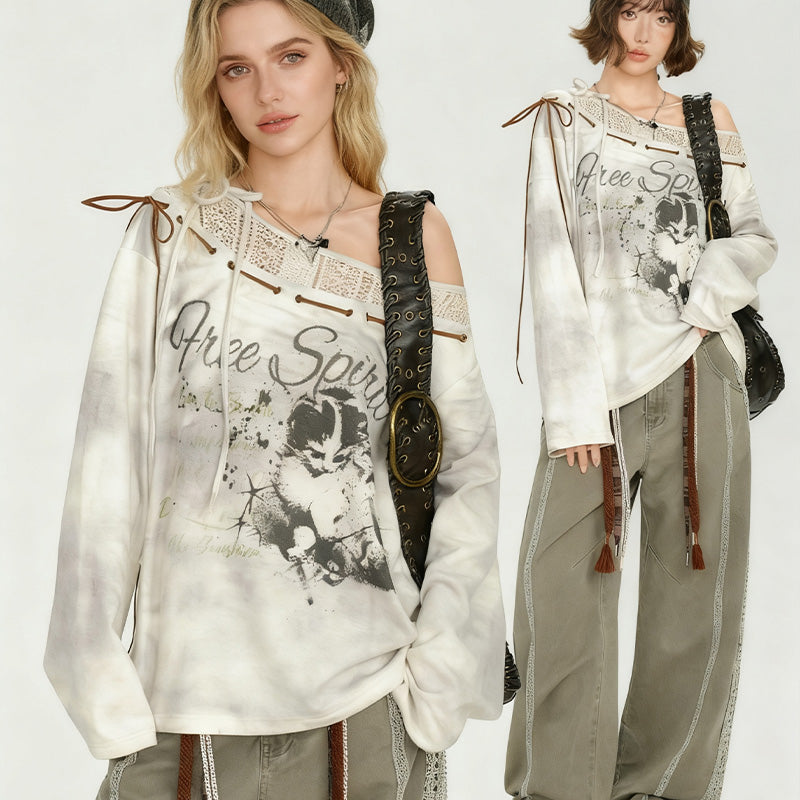 REINAREA American Retro Printed Paneled Stylish Long Sleeve T-Shirt