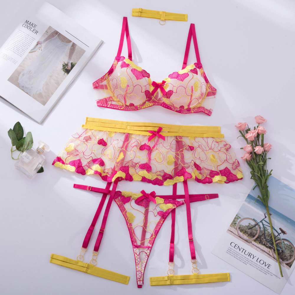 Floral Embroidery Fishnet Design Garter Lingerie Set