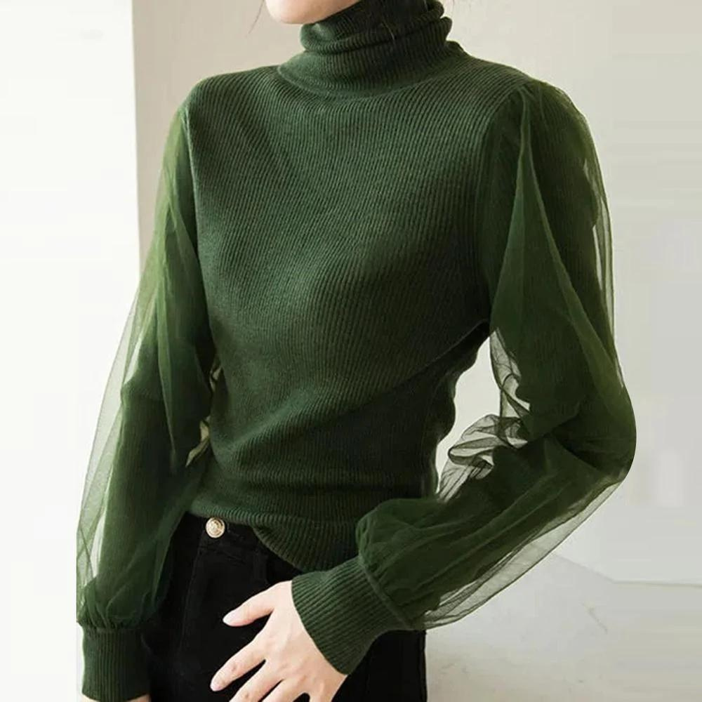 Green Turtleneck Double Layer Sheer Long Sleeves Sweater