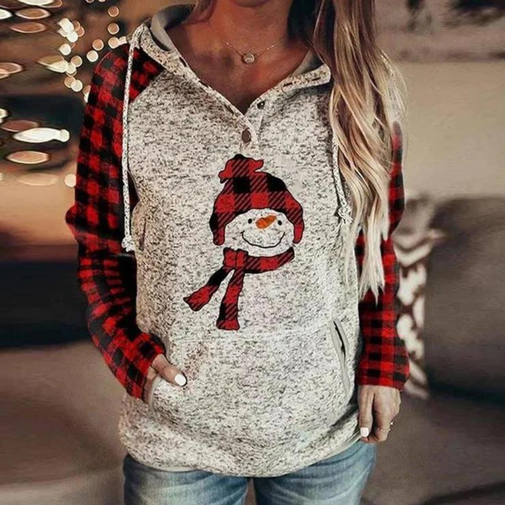 Spread the holiday cheer this season with this lightweight, long sleeve Christmas sweatshirt. A classic red and black plaid print on an adorable snowman and long sleeves gives this super-cute top retro vibes. Pockets in the front, buttons on the collar, and a drawstring hood add a laid-back style. Finish your look with jewelry, jackets, leggings, or jeans. Machine wash cold tumble dry low to medium heat. Iron if needed or lay flat to dry.