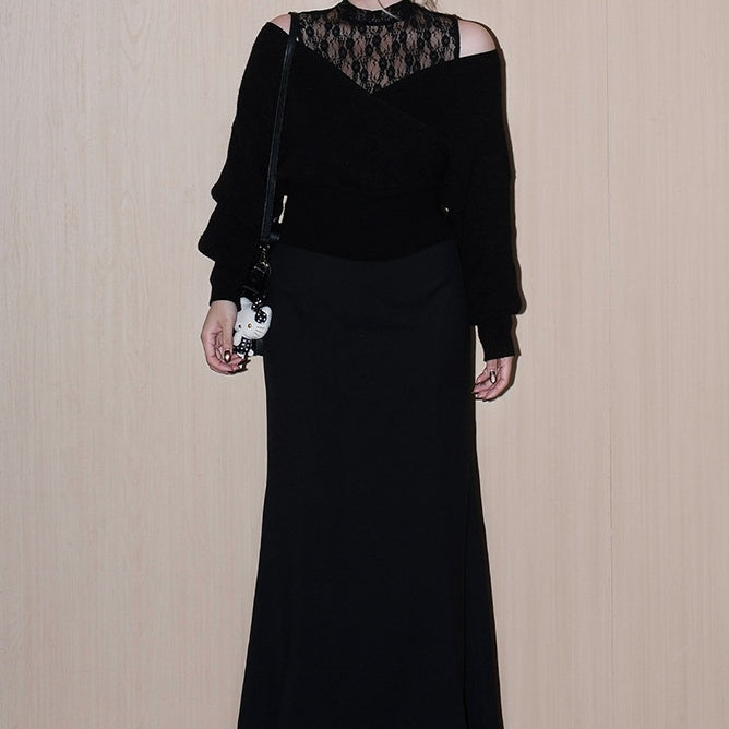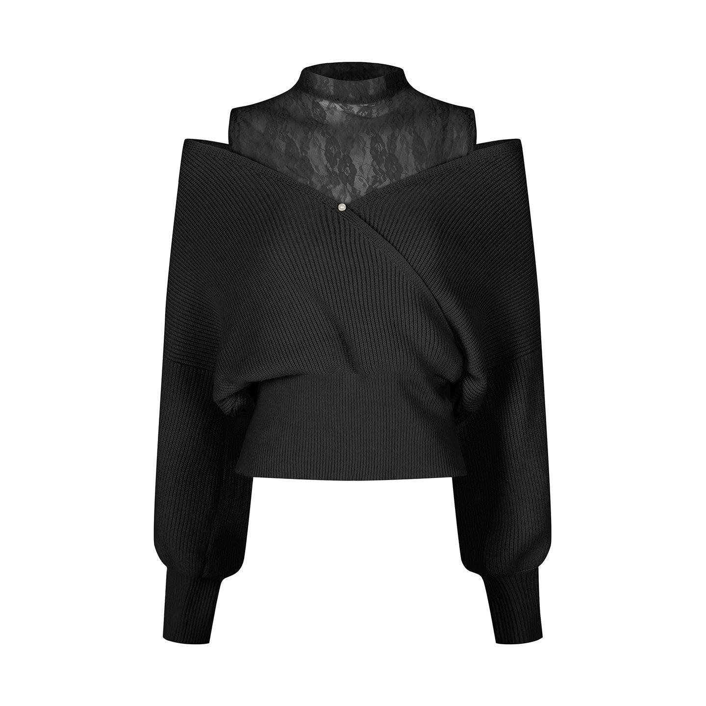 REINAREA Women's Fake Two-Piece Cold Shoulder Top One-Shoulder Patchwork Knit Blouse【111】