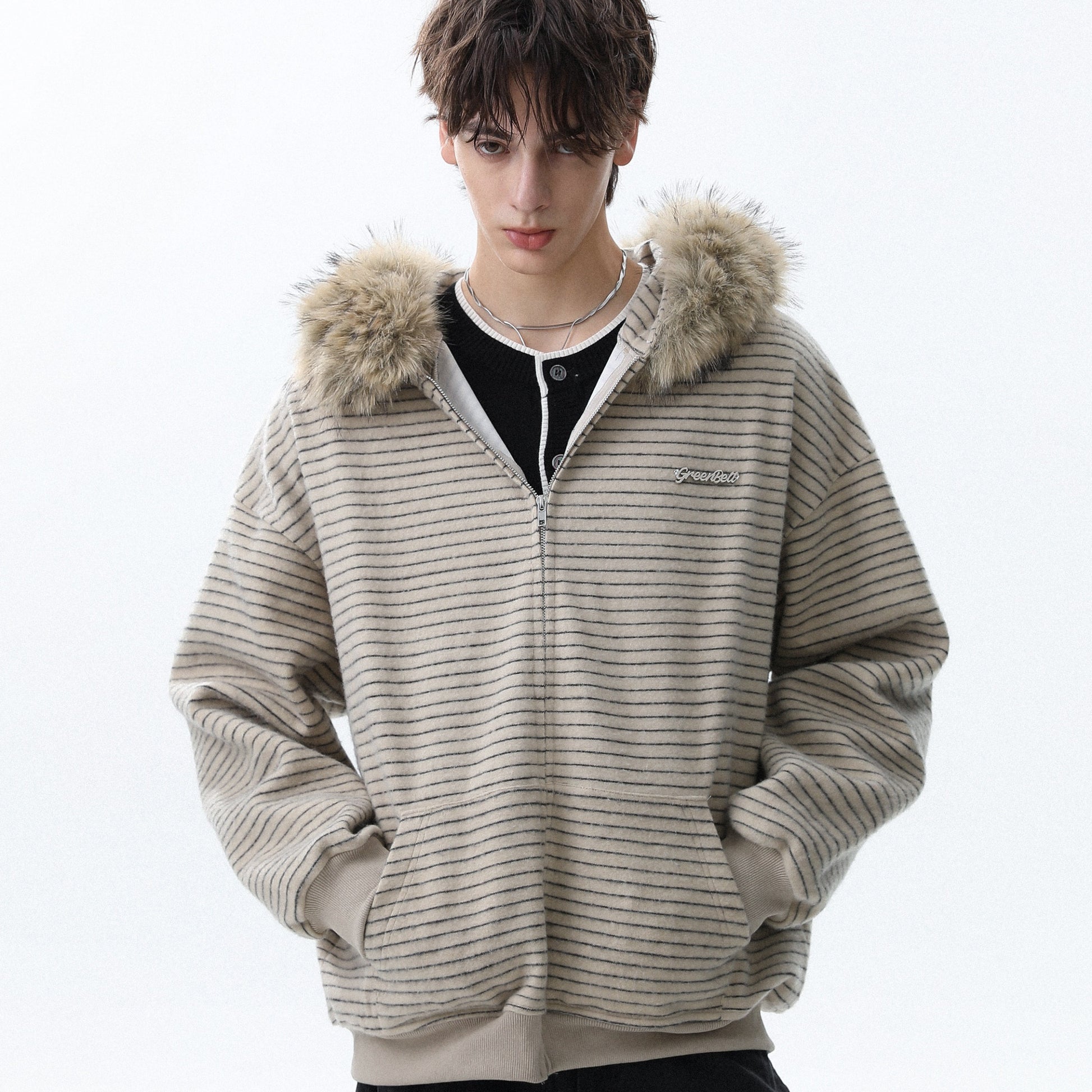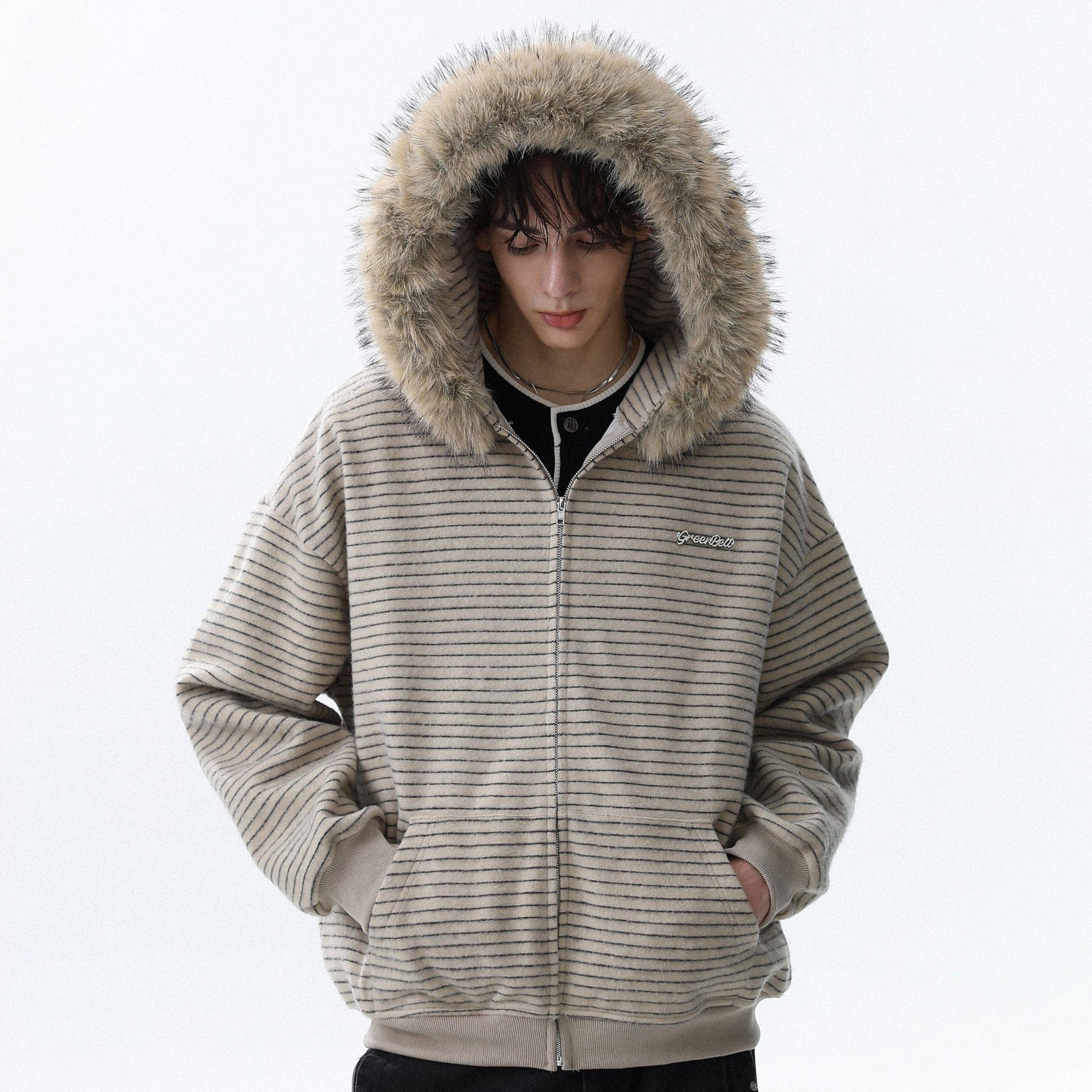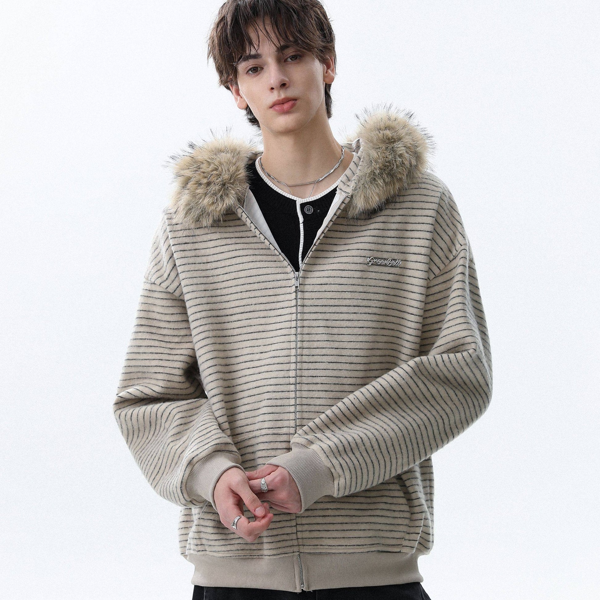 REINAREA Men's Striped Fleece Hoodie Zippered Cardigan with Removable Fleece Collar