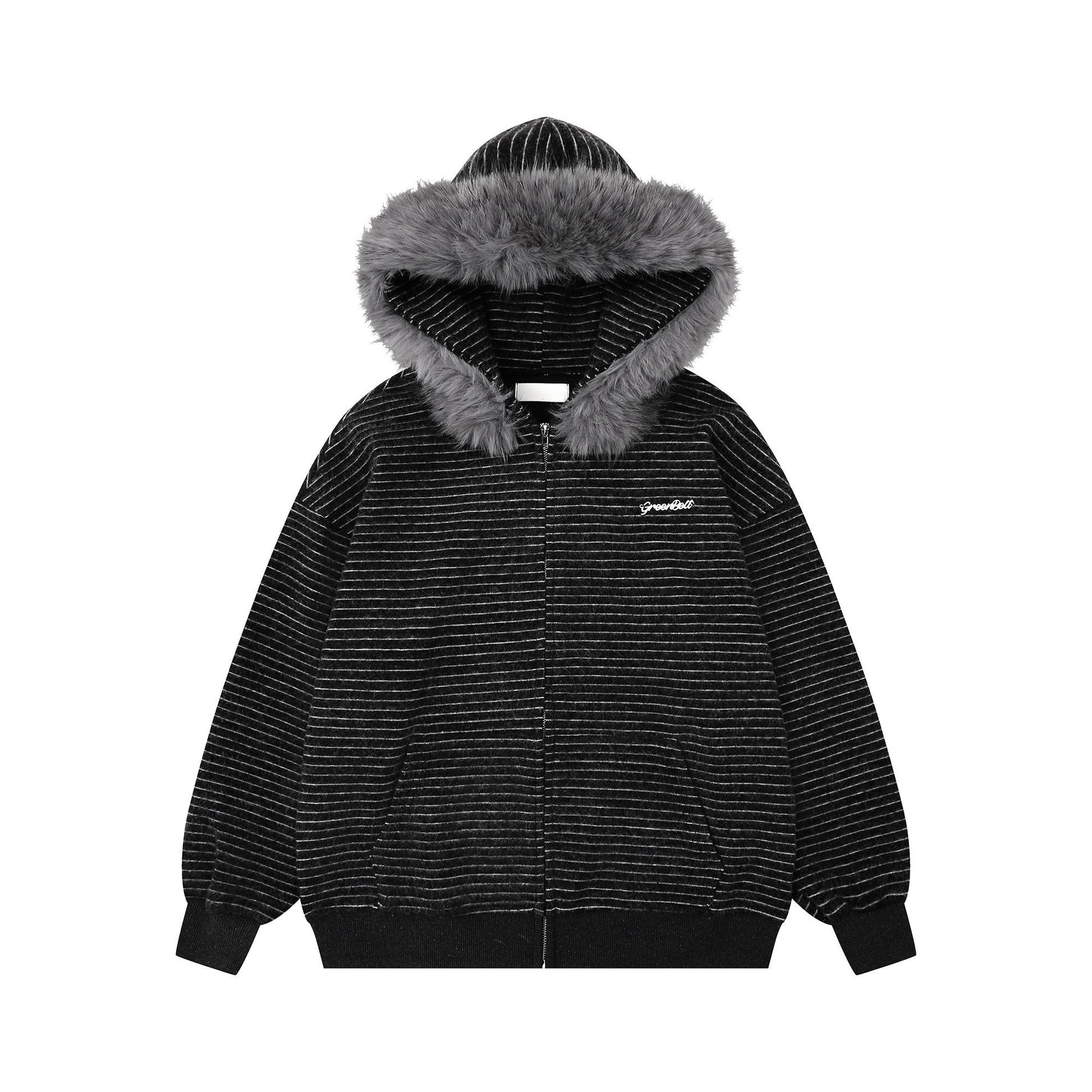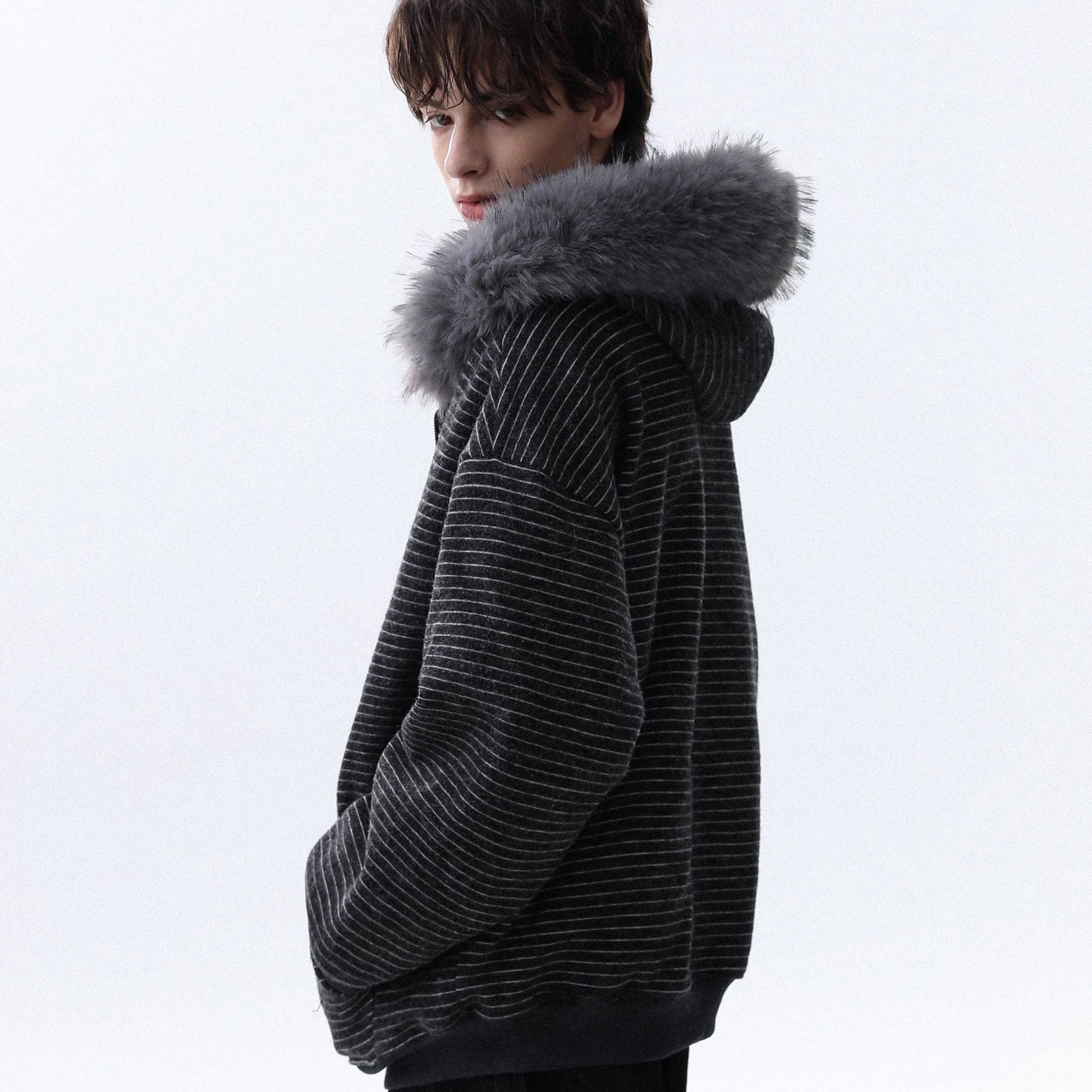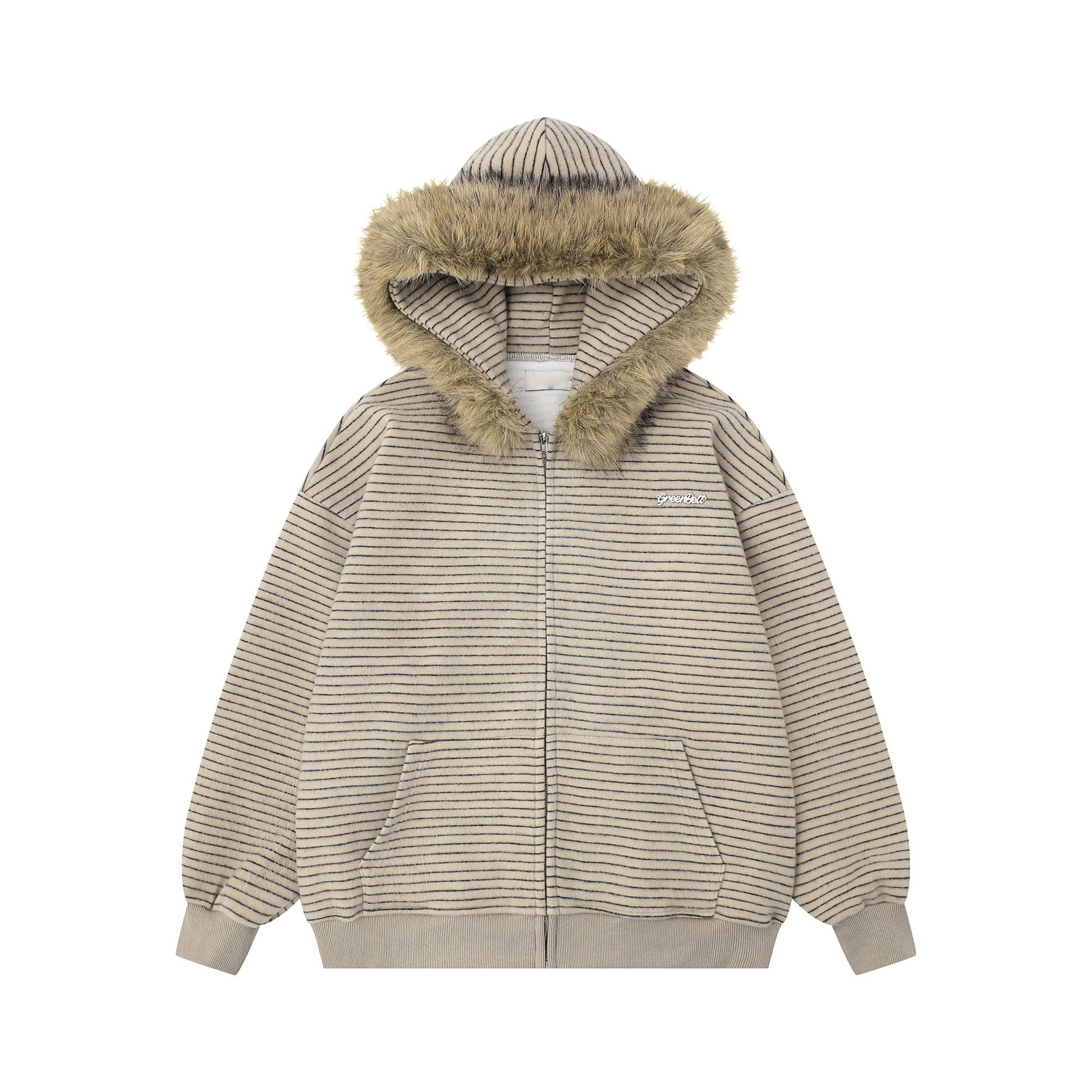 REINAREA Men's Striped Fleece Hoodie Zippered Cardigan with Removable Fleece Collar