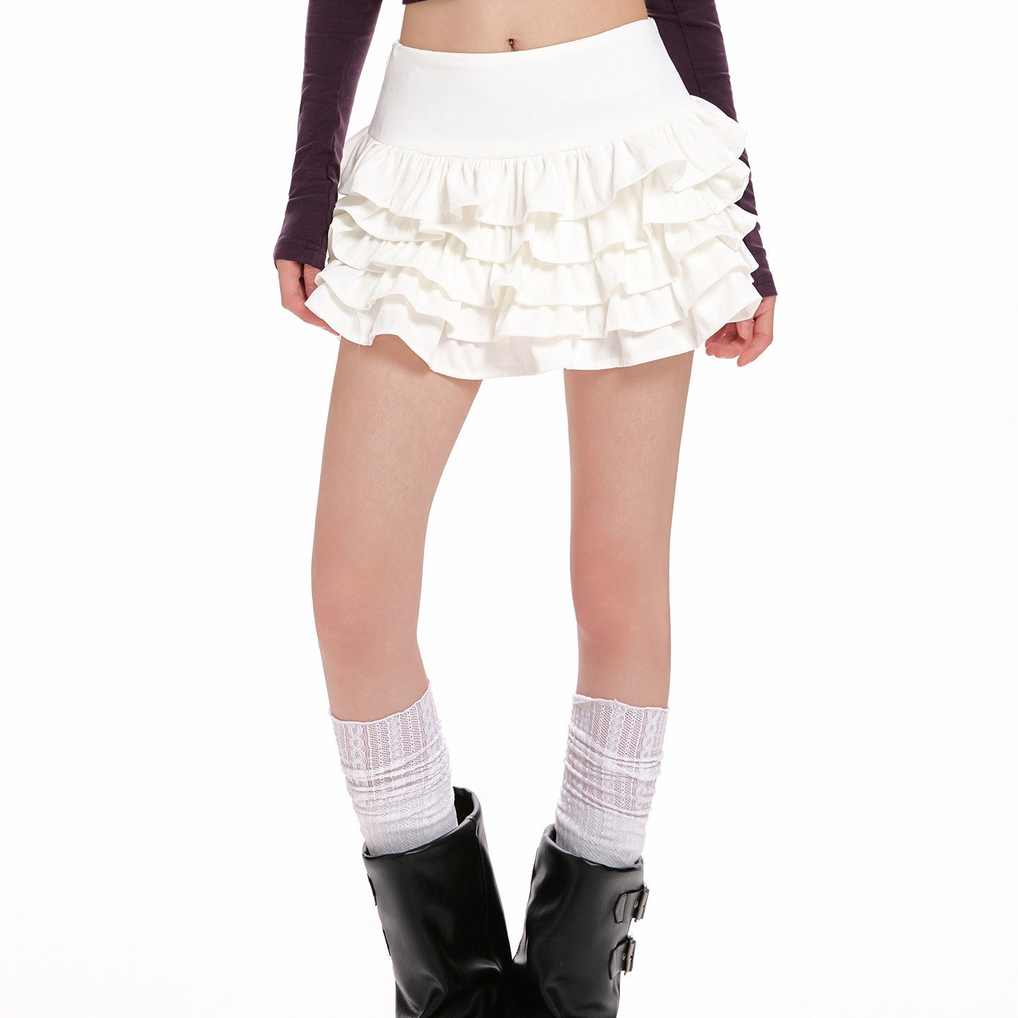 REINAREA White Puffy Tiered Skirt for Women High-Waisted A-Line Mini Skirt 【092】